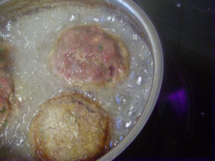 Смочить руки и сформировать1/8 часть фарша в лепёшку.