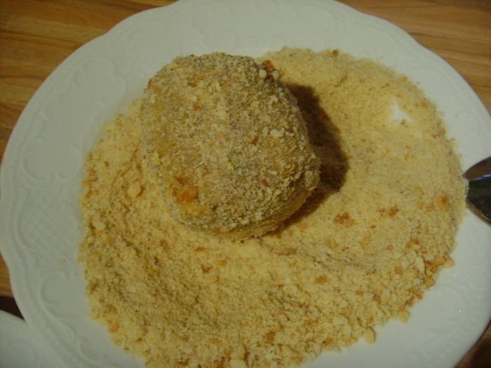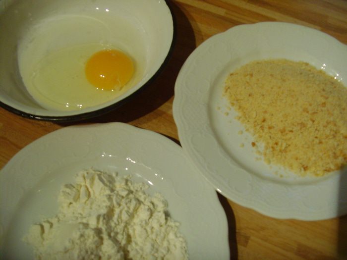 И сухарях. Кто желает двойную панировку, повторите процесс: мука, яйцо, сухари.