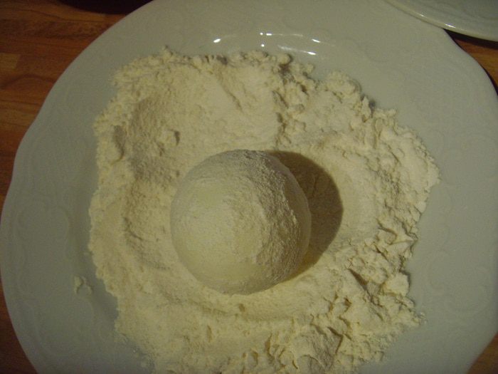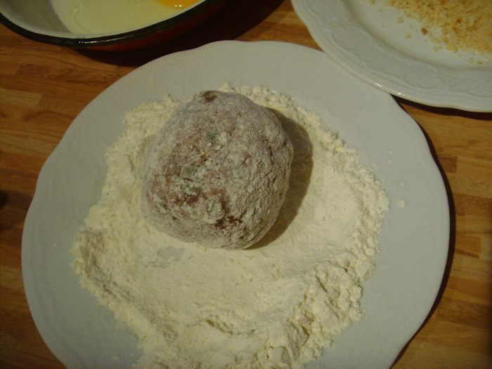 Яйцо слегка обвалять в муке. Так лучше будет держаться на нём фарш.
