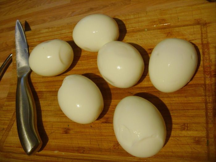 Сварить 8 яиц в крутую, очистить от скорлупы.