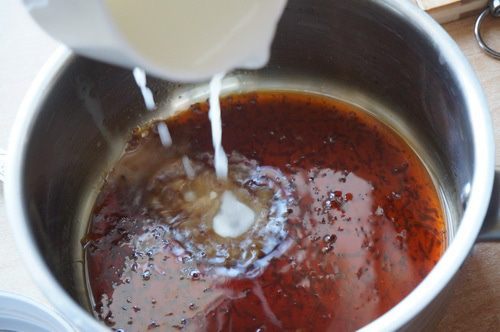 В конце варки добавляем кукурузный крахмал, разведенный с 30 мл воды. Снимаем с огня. Соус готов.