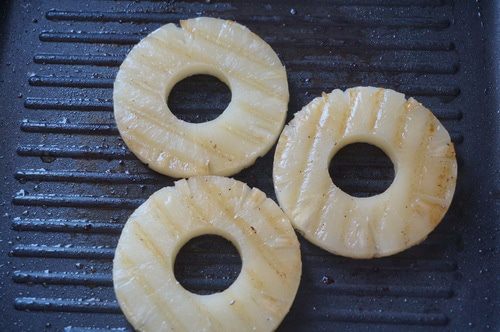 Затем обжариваем колечки ананаса на сковороде гриль.