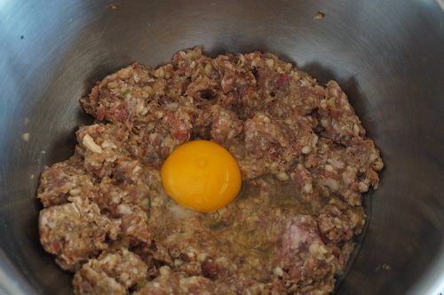 В готовый бараньий фарш, где уже есть соль,перец молотый черный, один зубчик чеснока добавляем одно яйцо,
