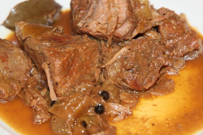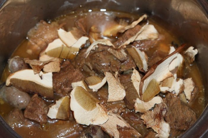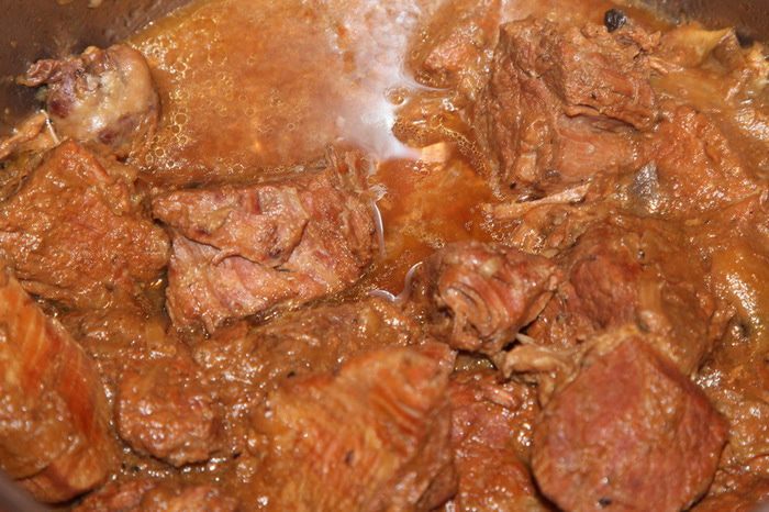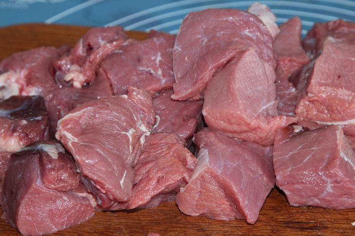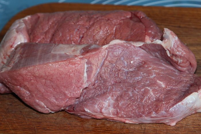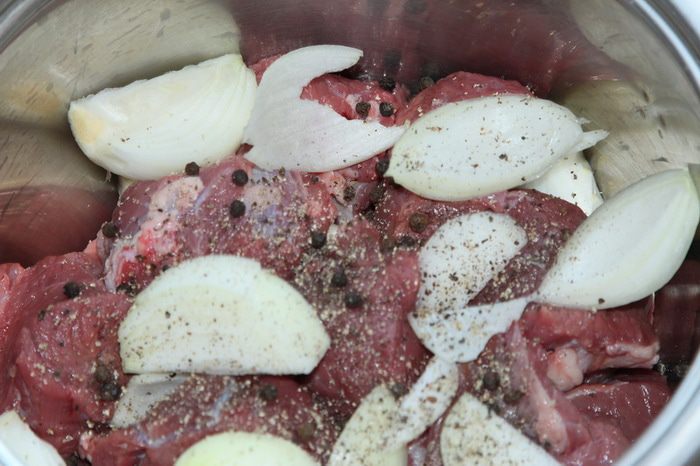Чистим лук, режем каждую луковицу на 4 части. В кастрюлю с толстым дном выкладываем слой телятины (говядины), сверху лук, перец горошком и лавровый лист, затем снова слой телятины, лук, лавровый лист и перец. У меня получилось 2 слоя. Сверху посыпаем молотым перцем. У Тани в рецепте белый перец, но у меня его не очень уважают, поэтому я посыпала черным молотым перцем.