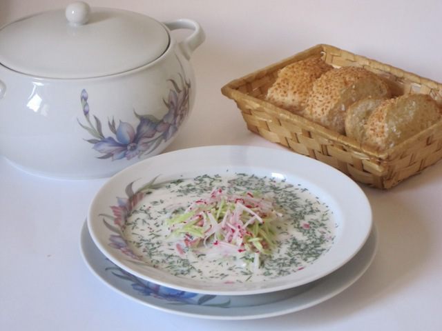 Лук и укроп мелко нарезать. Выложить в кастрюлю все подготовленные продукты, залить охлажденной кефирной смесью, перемешать. Поставить в холодильник охлаждаться.