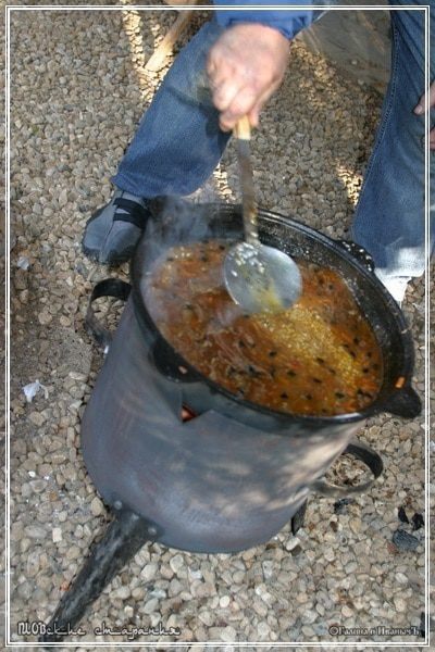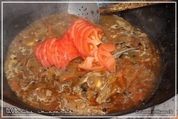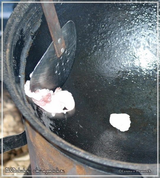 Как было уже сказано – зирвак больше не перемешиваем, но я все-таки делаю так: шумовкой от стенок отодвигаю время от времени содержимое. Даю возможность жидкости вернуться к стенкам.