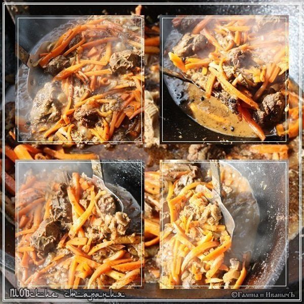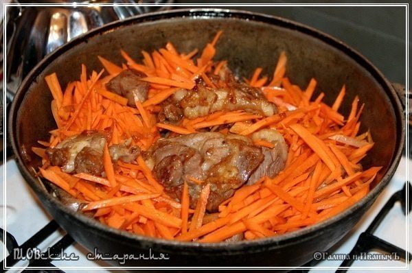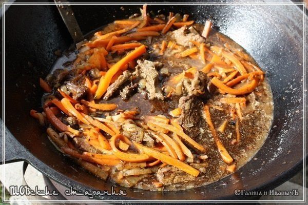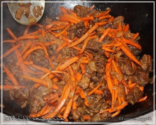 Постепенно морковь будет усаживаться. Становиться мягче и мягче. И пропитывать своим соком мясо и лук. Смешиваться с раскалённым маслом. Вот тут к аромату жареного мяса добавляется сладость моркови. Это уже передать словами очень и очень сложно. Я бы сказал – невозможно.
