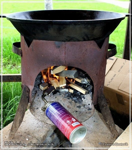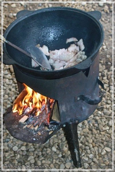 Ну вот. С продуктами закончили. То есть – все необходимое подготовили. Часть II. Посуда и всякое такое, без чего никак.… Готовим на открытом огне. В настоящем чугунном казане. Ибо всё остальное – от лукавого. Я имею в виду посуду. На плите, поверьте, газовой ли, электрической можно приготовить нисколько не хуже. НО!!! В одном не просто уверен, а … в общем – КАЗАН. Да, в принципе, можно приготовить и в кастрюле, и в противне даже …, но казан есть казан. И главное в казане, пожалуй, два момента. Форма. И материал. Предпочтительнее всего в виде чаши со сферическим дном и из чугуния, который из всех железов более всего подходит для воплощения казана «в жизнь». Вот он. Чугунный, настоящий казан. Не старый, конечно, но что выросло, как говориться, то и выросло. Казан может быть установлен на печурку, так сказать, или таганок – как вам удобнее и привычнее/