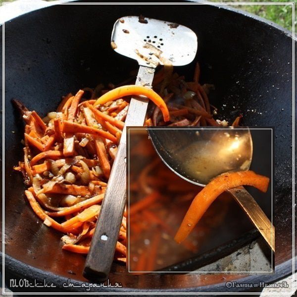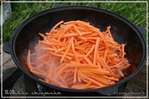 Жарим морковку до состояния «пока моркошка не свесила ножки», т.е. пластинки станут мягкими, но в то же время гибкими, не разваливающимися. И … если вдруг вам покажется, что в казане началась засуха, не стесняйтесь добавить немного воды.