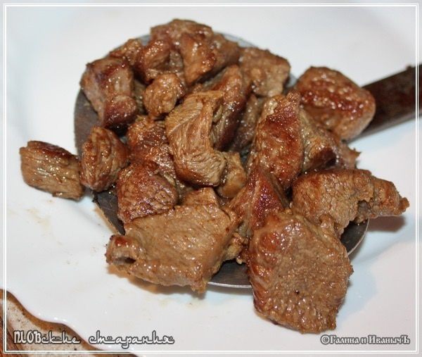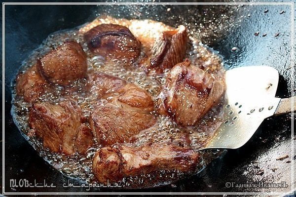 Мясо надо, как было уже сказано, ЖАРИТЬ!!! Не тушить, а именно, повторюсь, жарить до образования стабильной корочки. Чтобы внутри оно осталось сочным.