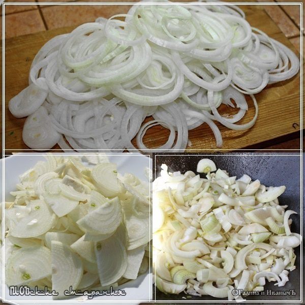Почистив, лук надо нарезать. Полукольцами или кольцами особо разницы не имеет. Только тончить не стоит. Миллиметра три, а лучше около пяти режьте.
