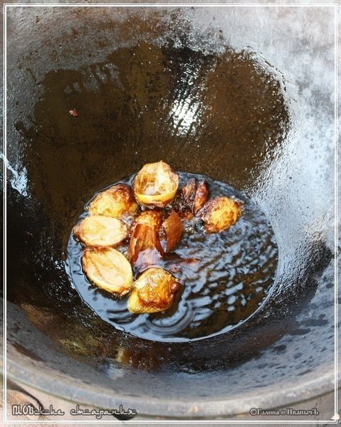 Чеснок. Пришла его очередь. Отправляем головки в казан. Целиком и в остатках одёжки. Притапливаем, чтобы он целиком скрылся. Пусть тоже варится – томится.