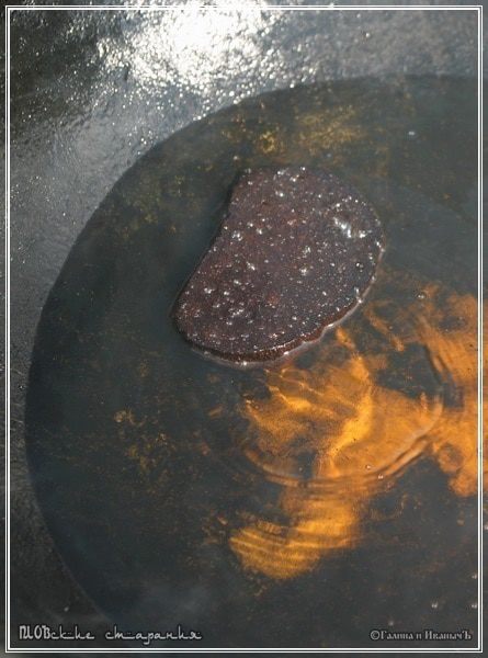 Фенечка вторая Бросьте в казан кусочек хлеба. Не имеет особого значения, какого, но я бросаю чёрный. Можно ещё, например «Рижский». И жарим его. Довольно интенсивно, что называется. Вот до такого «чёрного» состояния. Потом, как бы, не было это грешно, придётся его выбросить.