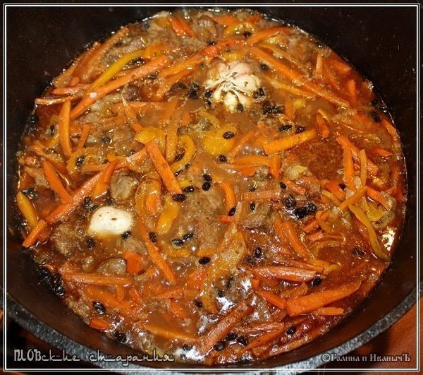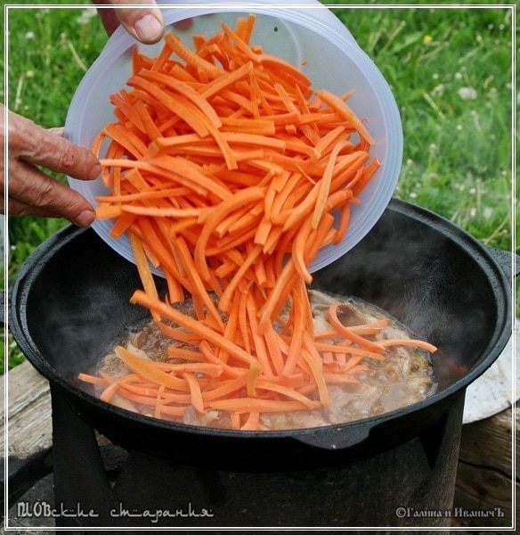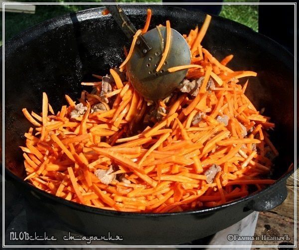 Замечу, что если вы брали мясо в крупных кусках и, обжарив, вынимали его из казана, то вернуть его в казан самое время – на середине процесса готовки моркови.