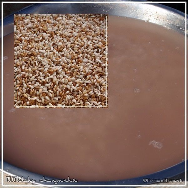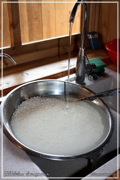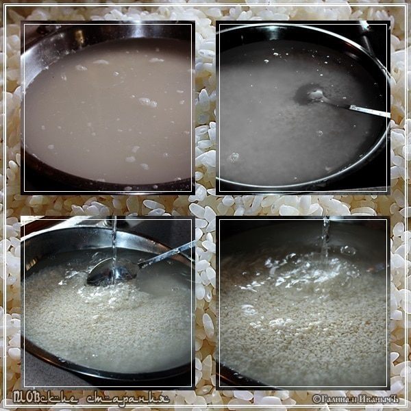 Дальше. Главное – тщательным образом промыть. Чтобы вода, с риса стекающая, была совершенно и абсолютно прозрачной. Т.е. чтобы крахмала не осталось. Сначала, ненадолго, замочим. Скорее хорошо намочим. Вот что образуется, как только воду нальем. И потом будем промывать в проточной воде. В углу картинки посмотрите - вот такой он должен стать.
