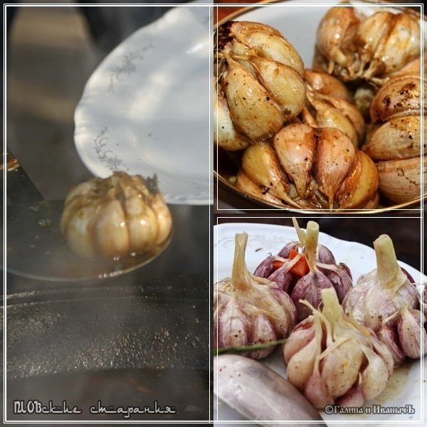 Чеснок надо просто разделить головки на зубчики и уже каждый будет … в общем, просто, извините либо высасывается содержимое из зубчика, либо выдавливается. Кто-то любит на хлеб выдавить, кто-то на мясо. В общем, в соответствии со вкусами и предпочтениями.