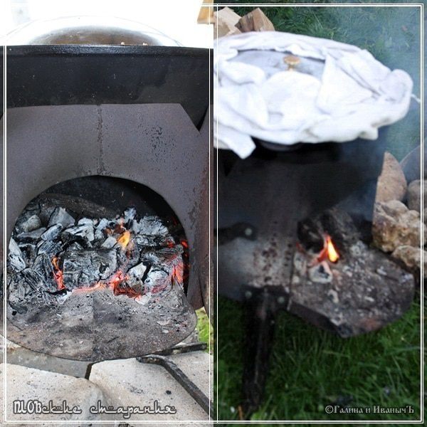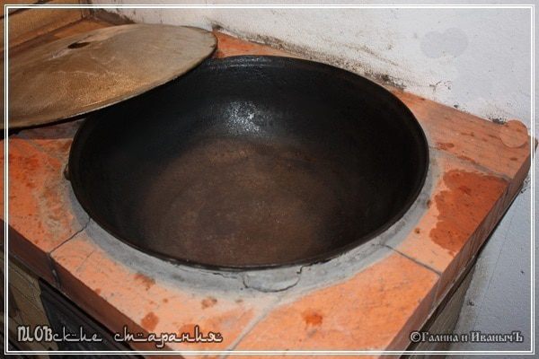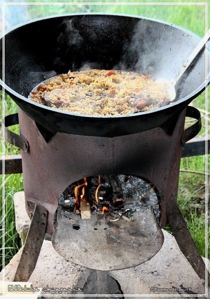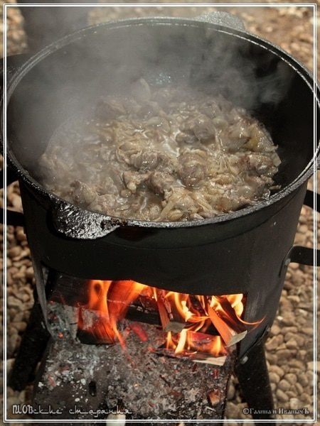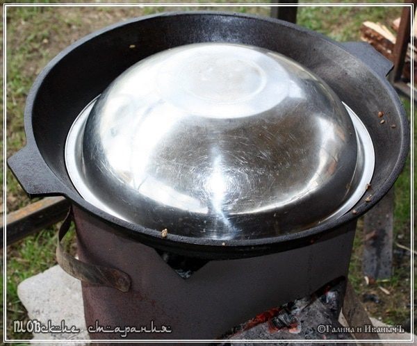 А потом накрываем казан крышкой и оставляем на очень маленьком огоньке. Практически на угольках, чтобы нагрев был не больше «свечки», что называется. Нелишним будет крышку уплотнить полотенцами.