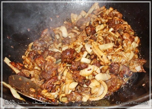 Через некоторое время начинается выделение сока. Огонь под казаном надо держать немного выше среднего. И постоянно перемешивать. Лук, как уже говорилось, надо обжаривать. До золотистой мягкости. Чтобы сок луковый выпарить до почти того «масляного» объёма, что был в казане перед луком. В принципе, вот такое состояние – уже показатель готовности.