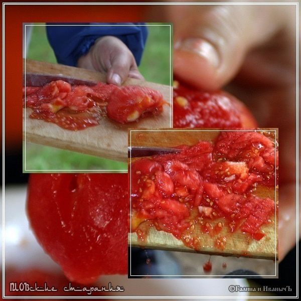 На этом этапе можно применить дополнительные, овощные, так сказать, фенечки. Можно это делать, а можно и не делать. Можно сделать, как в случае с «масляными» одну, или две, или все вместе. Вкус плова не ухудшится, он просто станет другим. Но не хуже – отвечаю. Итак, первая. Помидор Только хороший помидор. Настоящий. Сладкий и ароматный, а не кислый. Ошпарьте его слегка кипятком и снимите кожицу. Потом мелко порубите. И отправьте в казан.