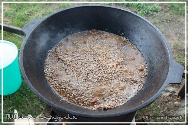 Начинать надо с того, что прокалить этот «битый макарон» в раскалённом казане. Высыпаем … и минут пятнадцать-двадцать пять, постоянно перемешивая, прокаливаем. Готовый БМ должен приобрести слегка розоватый оттенок и звенеть … ну прям как камушки.