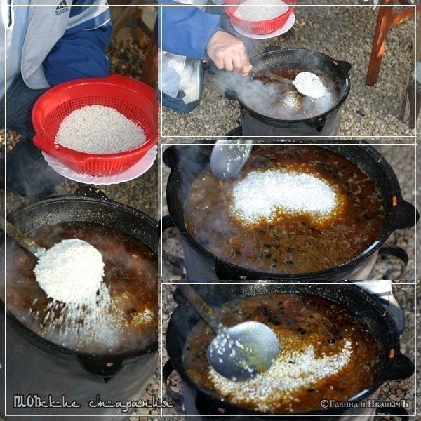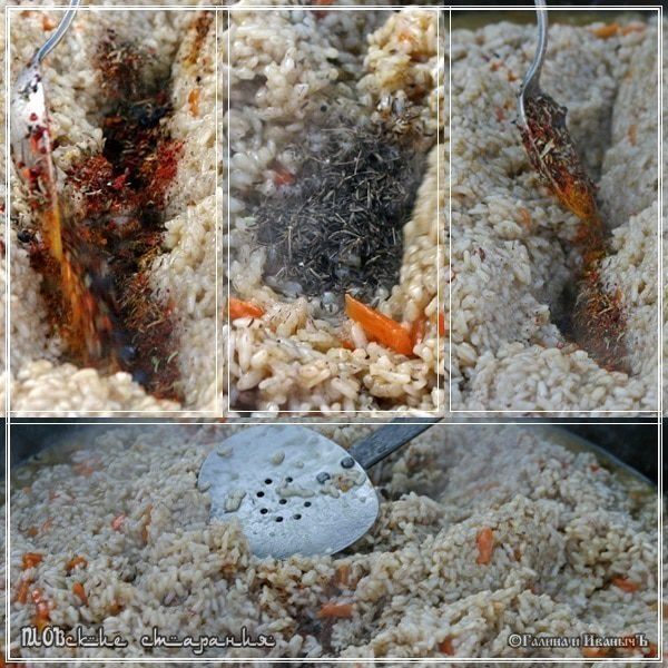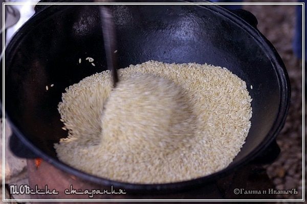 Ну а зирвак уже готов к приёму риса. Начинается заключительный этап. Часть IV Заключительный этап. Варим рис Рис уже постоял. Лишняя вода стекла. Закладываем его в казан. Тут спешить нельзя, но и медлить, особенно не стоит. Спокойно и не отвлекаясь надо действовать. Делать все надо очень аккуратно. Не бухаем рис в котёл, аки какую-нибудь там перлогречку, а выкладываем рис в казан. Почувствуйте, что называется, разницу. Рис закладывается поверх зирвака. Шумовкой, слоями. Так, чтобы он, рис, покрыл зирвак.