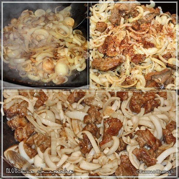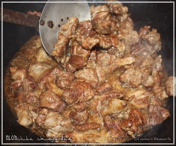 А уже потом, в лук выложить мясо. И жарить его на сильном огне до поджаристой красноватой корочки. На мой взгляд, это нужно делать, когда мы хотим получить плов мягкий. Потому что мясо будет мягче. Как бы немного тушеное. Ибо сохранит оно под корочкой сочность. Но, я чаще всего использую другой способ. То есть лук выкладываю в казан уже после того, как обжарил мясо