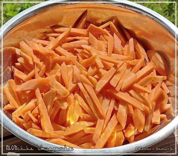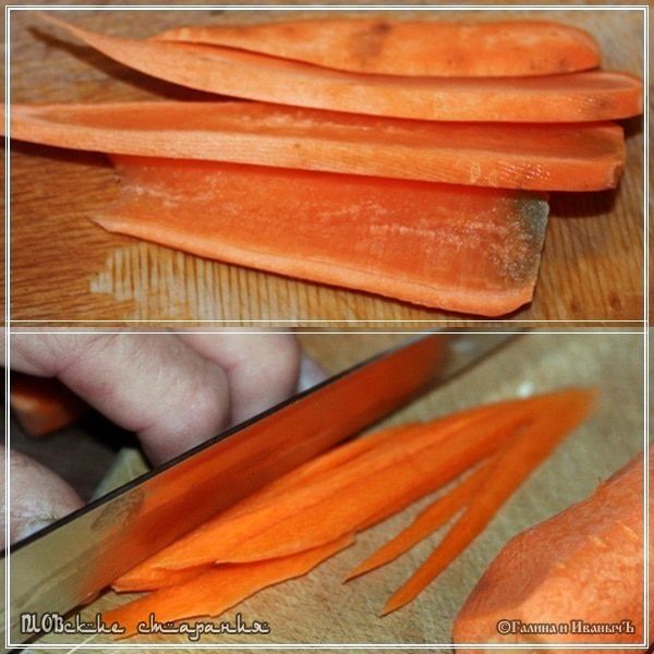 Для более ленивых. Или, если нужна скорость приготовления. Сначала морковку разрезать на дольки, толщиной примерно миллиметра три – четыре, а потом их уже тоже порезать на брусочки.
