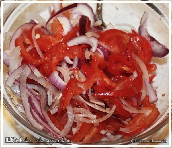 Часть VI Про сопутствующее Сначала про салат. Тонко – тонко режется лук. До прозрачности. Так, чтобы небо сквозь него было видно. Немного замачиваем – промываем. В очень холодной воде. Можно даже засыпать льдом и дать ему растаять. И так раза три. Чтобы излишнюю горечь вымыть. Если использовался салатный, сладкий лук, то этого можно не делать. Потом также тонко, прямо над луком, чтобы сок не терять, режем – пластаем помидоры. Потом солим. Как обычный салат. Если все, кто будет употреблять, одинаково относятся к перцу, то можно использовать чёрный и т.п. ароматические острые перцы. Но лучше всё-же просто поставить их на стол. Каждый себе по вкусу приправит. Очень к плову блюдо полезное и нужное.