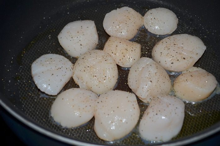 Посолить и поперчить крупные гребешки и обжарить на горячей сковороде по 4 мин. сторона. Отложить в тарелку в сторону.