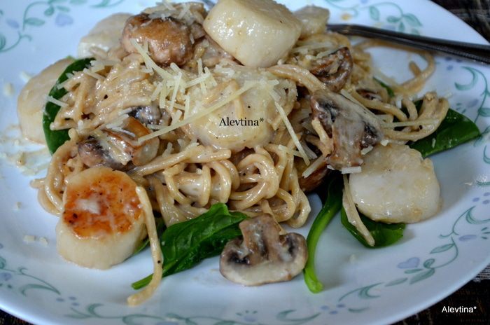 Вкусный рецепт для любителей морепродуктов. Сочетание грибов, гребешков и шпината как ни странно все это вкусно.