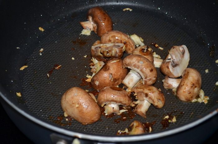 Обжарить грибы с мелко нарезанным чесноком. Грибы можно порезать на половинки или на пластинки. Мы любим крупными частями. Добавить сливочное масло.