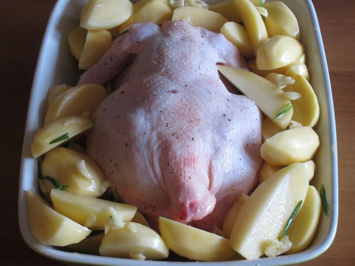 Выложить курицу грудкой вниз на противень ,смазанный оливковым маслом,выложить картофель и запекать в разогретой до 195 ° С 30 минут.Затем курицу перевернуть и запекать 30 минут.Увеличить температуру до 220 ° с и запекать ещё 20 минут.