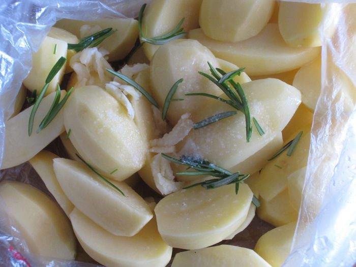Чеснок мелко порубить.Картофель нарезать дольками,положить в полиэтиленовый пакет,добавить соль,розмарин,оливковое масло, сок 1 лимона , чеснок и хорошо встряхнуть пакет .
