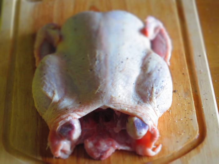 Курицу вымыть,обсушить и натереть перцем и солью внутри и снаружи.