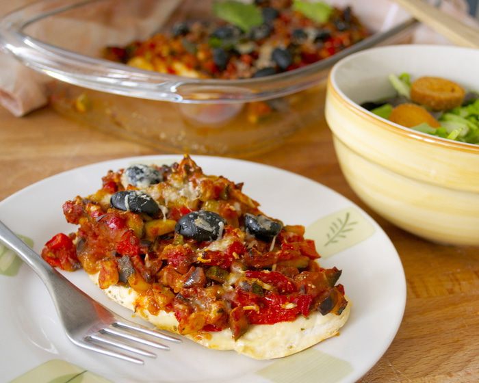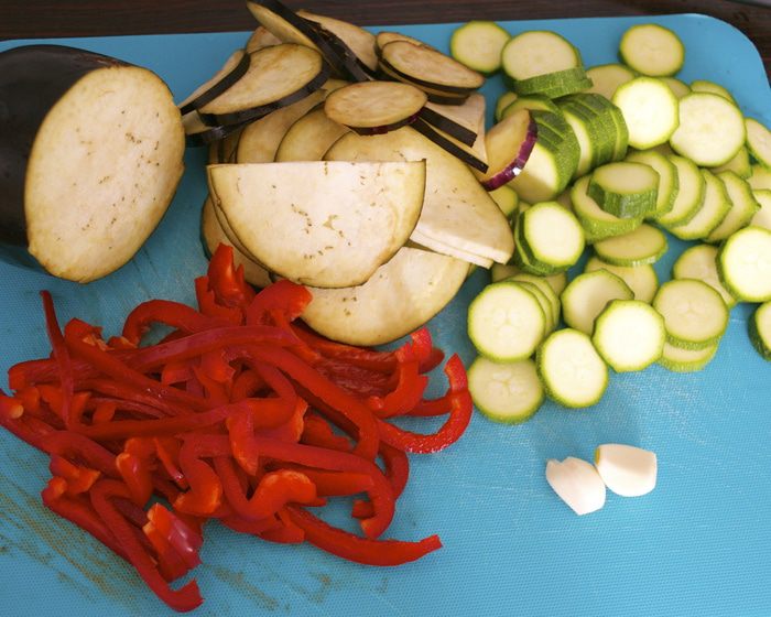 Огнеупорную форму для выпечки смазать одной столовой ложкой масла. Все овощи вымыть и подготовить... Обрезать "хвостики"/"ножки"... Кабачок и баклажан нарезать тонкими кружочками. Красный сладкий перец очистить от семян и нарезать тонкими полосками. Чеснок очистить и нарезать пластинами.