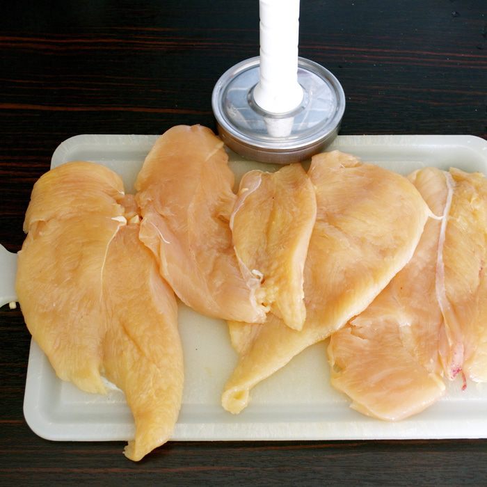 Тем временем куриную грудку нарезать (продольно) на четыре части. Слегка отбить.