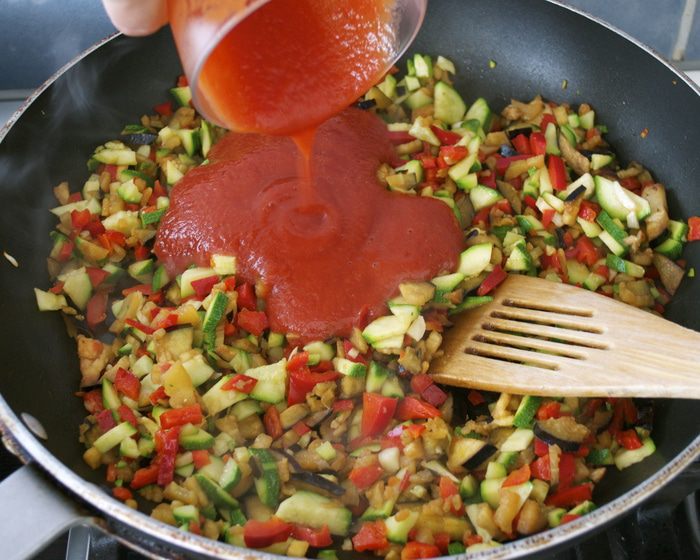 Добавить томатный соус "пассата" и томатный концентрат... Посолить, поперчить по вкусу. Добавить сушеные прованские травы, перемешать и готовить еще минут 8 на достаточно сильном огне. Овощи не должны превратиться в "кашицу".