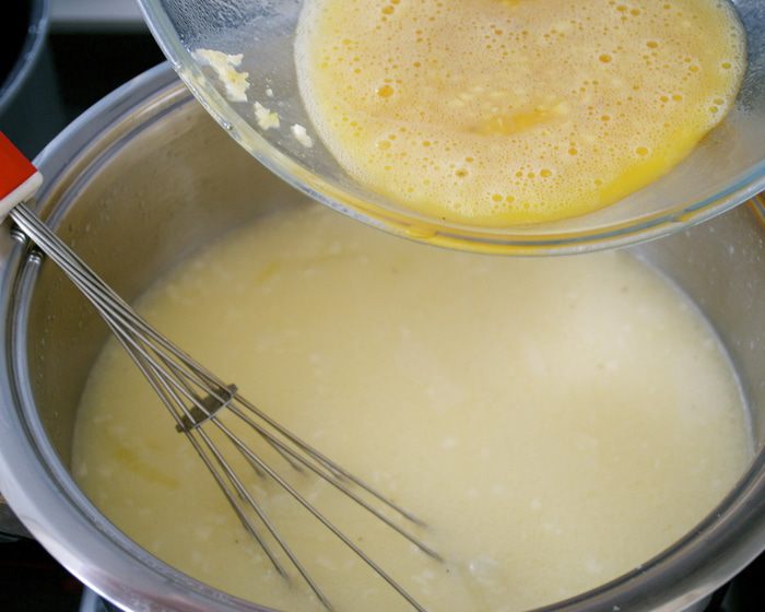 Кастрюлю снять с огня и при постоянном помешивании (чтобы белки не свернулись!) осторожно влить понемногу смесь в бульон. У меня все получилось благополучно! Главное, снять с огня бульон и вливать смесь постепенно! )))