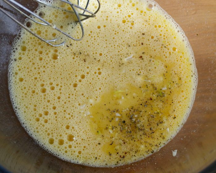 Мелко порубить чеснок и добавить к яйцам смесь из рубленного чеснока, соли и перца.