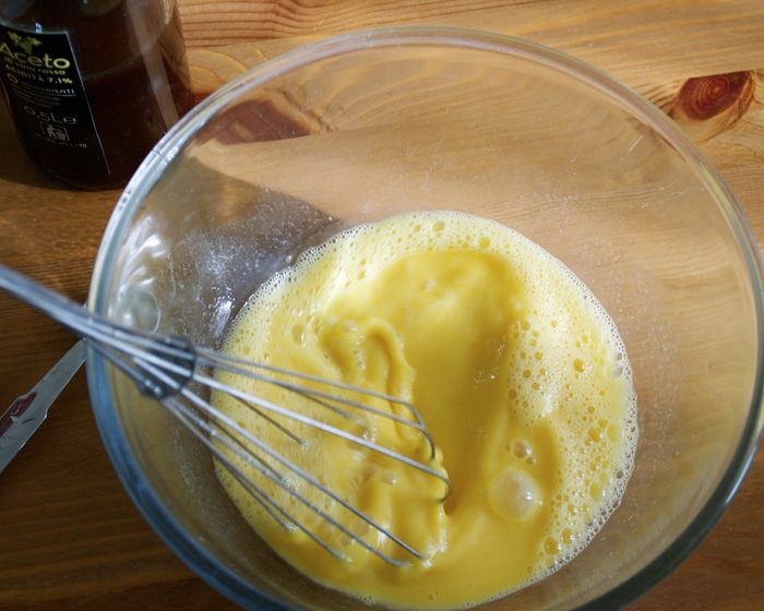 В глубокой миске взбить яйца с уксусом.
