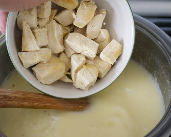 Куриные грудки нарезать на порционные кусочки, выложить в кастрюлю, залить водой и варить до готовности. Затем вынуть мясо, процедить бульон и снова поставить на медленный огонь.