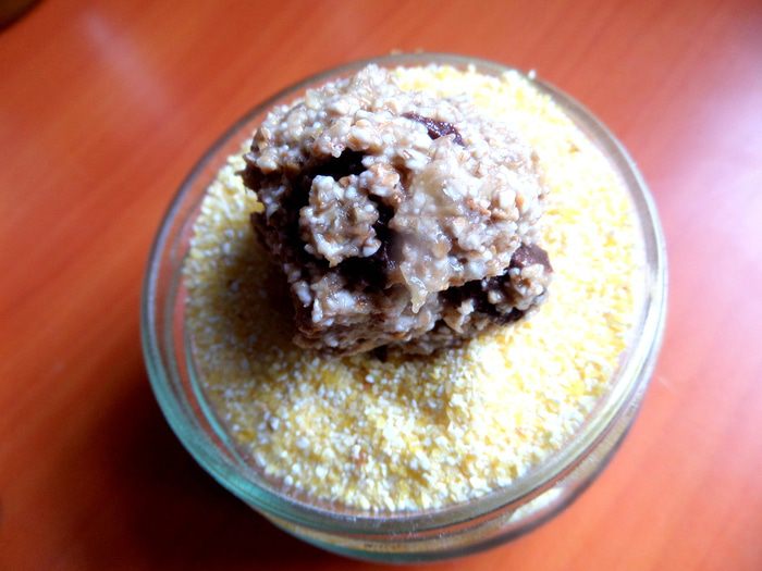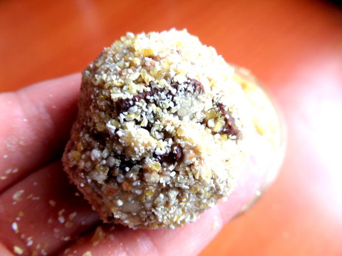 Можно обмакнуть в молотые орешки, но я решила взять крупу.
