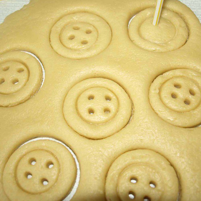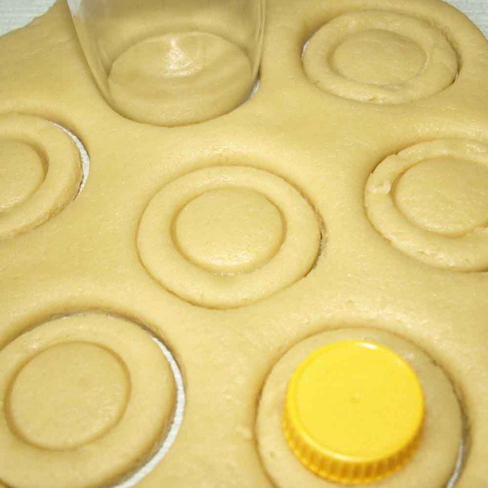 Тесто раскатать и бокалом вырезать кружки. Крышкой от растительного масла или пепси-колы и т.д) в центре делаем отпечаток круга поменьше.