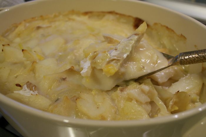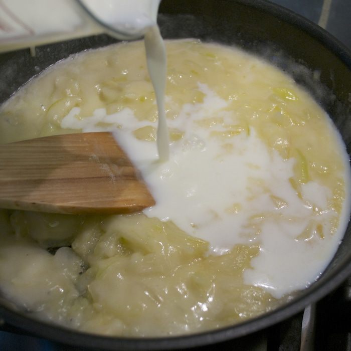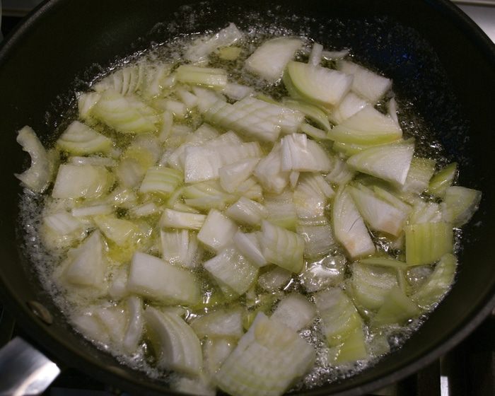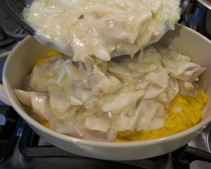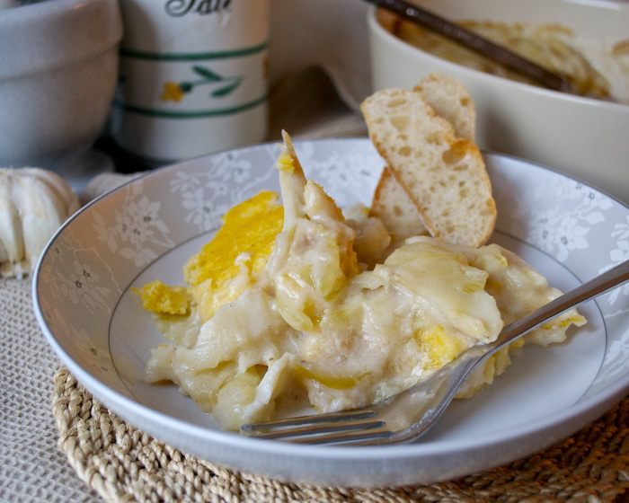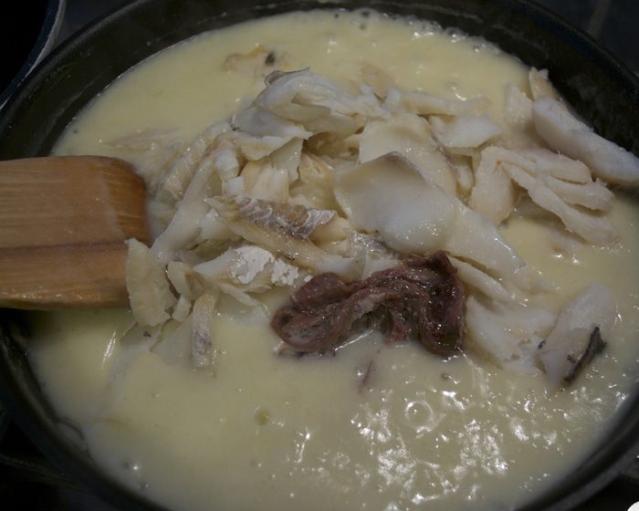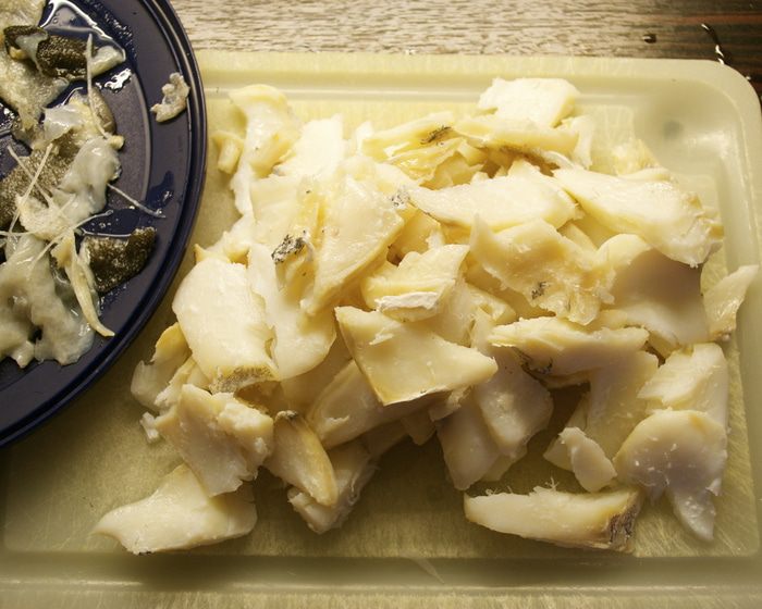 Вымоченную треску положить в большую кастрюлю, залить 2,5 л холодной воды. Довести до кипения, слить воду, налить новую и снова довести до кипения. Уменьшить огонь, накрыть и варить 15-20 минут, пока слои рыбы не будут легко отставать.