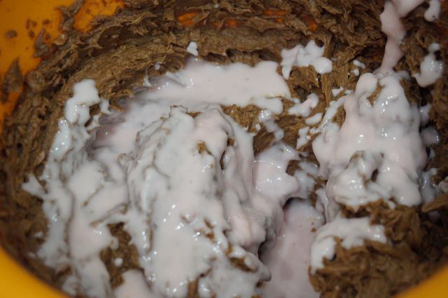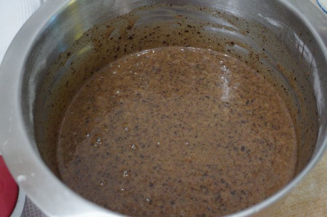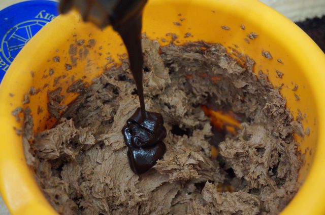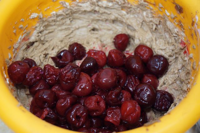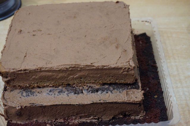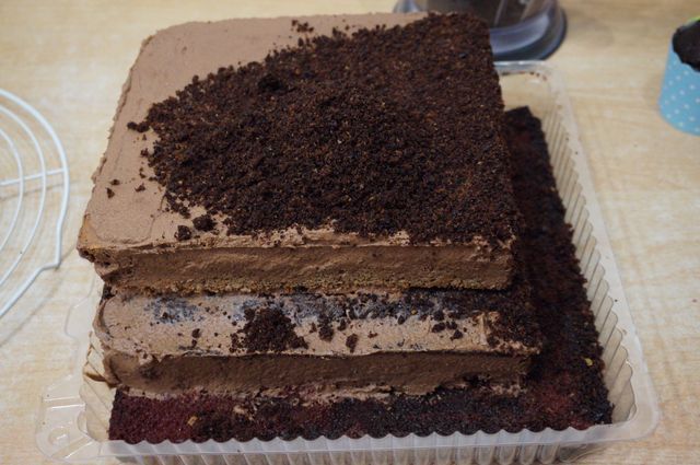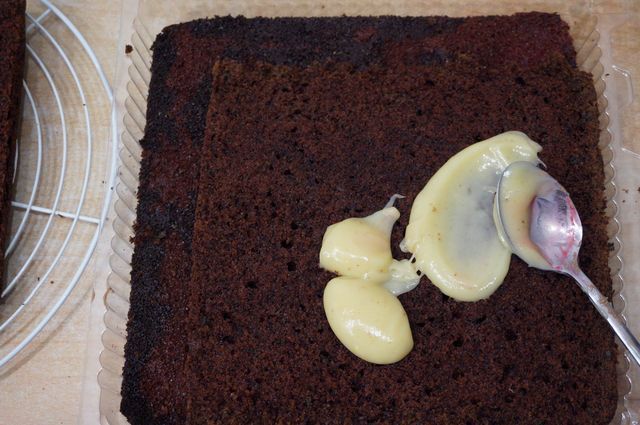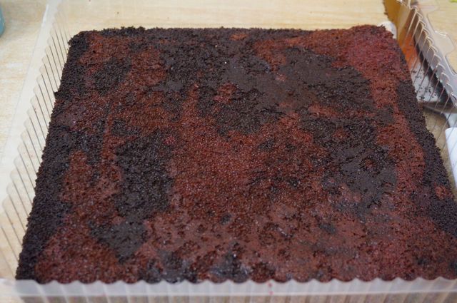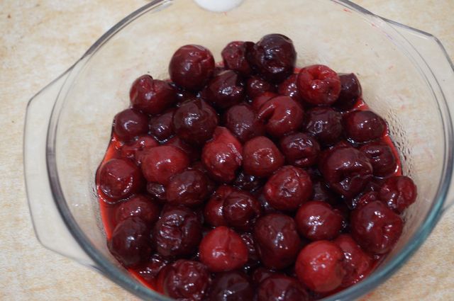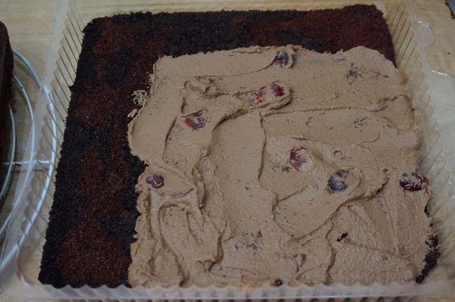 Сборка торта. Начинаем с конца, так сказать. Надо сразу же определиться с основой торта (большая досточка, поднос, пластиковая упаковка для торта, как, например, у меня и т.д.), в зависимости от этого будем формировать торт. Корж №3 кладем на дно (обрезаем, если того требует "тортовница"), пропитываем жидкостью, слитой с вишен.