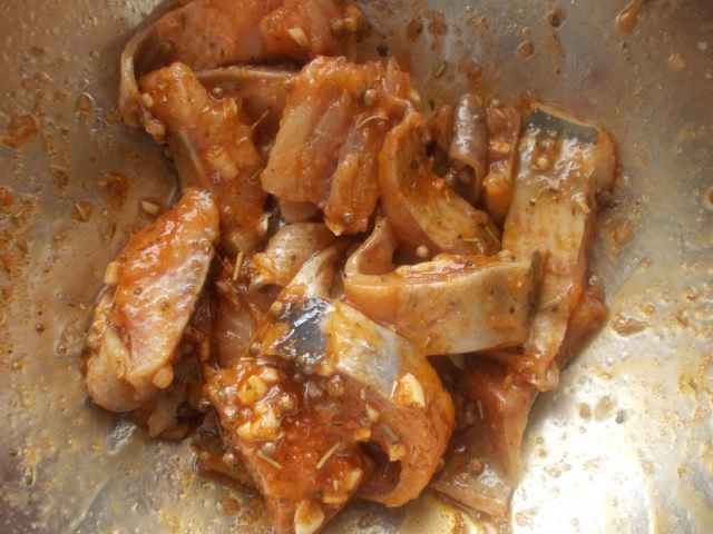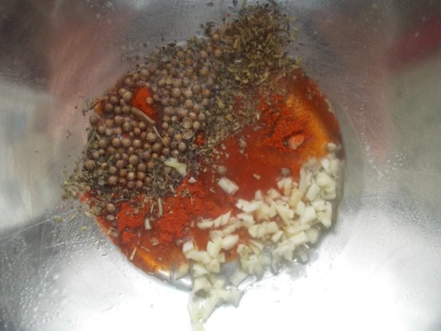Чеснок измельчить,кориандр я взяла зернами,но можно молотый. Специи складываем в миску,в которой будет мариноваться сельдь.