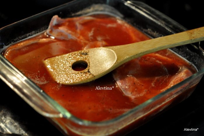Сверху выложить свиные отбивные, они должны полностью утопать в этой смеси. Поставить в духовку на 45 мин.