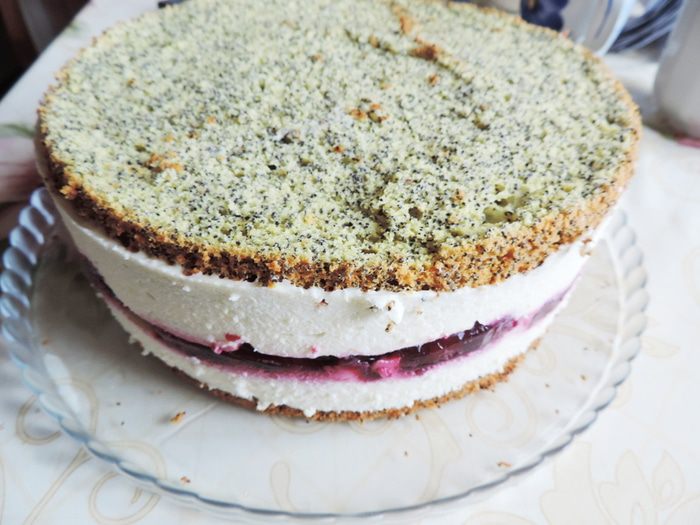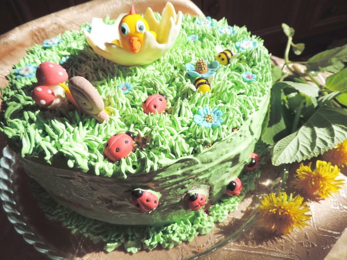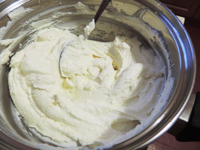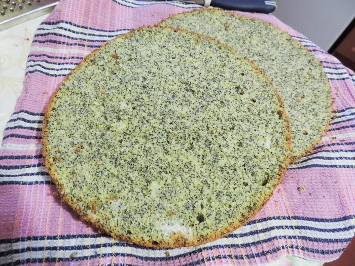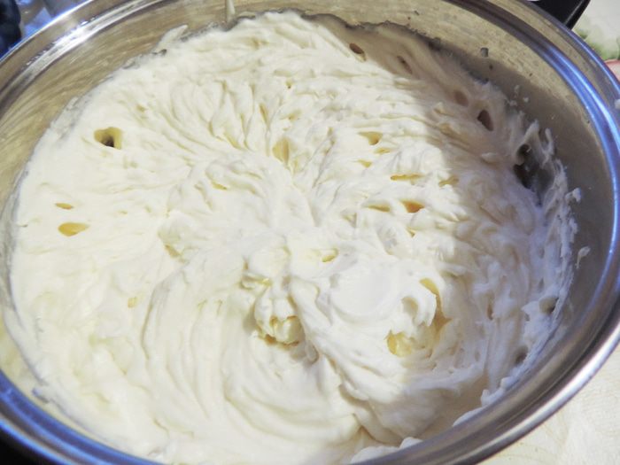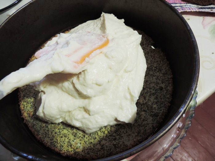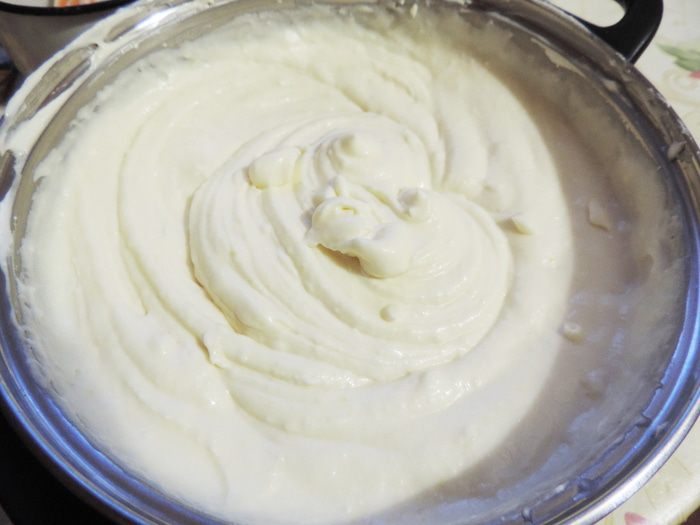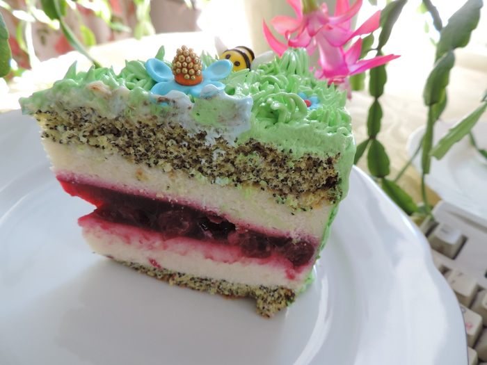 Готовим белковый заварной крем. Как это сделать, смотрим тут http://www.edimdoma.ru/retsepty/65842-tort-vafelnaya-bezuminka. Смазываем торт кремом. На боках, там где желе, крем будет медленно подтаивать, так что если вы хотите, чтоб торт надолго сохранил презентабельный вид, рекомендую бока торта предварительно покрыть растопленной белой шоколадной глазурью с молоком (примерно 100г глазури+3ст.л молока). Я спешила и этого не делала.