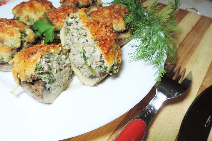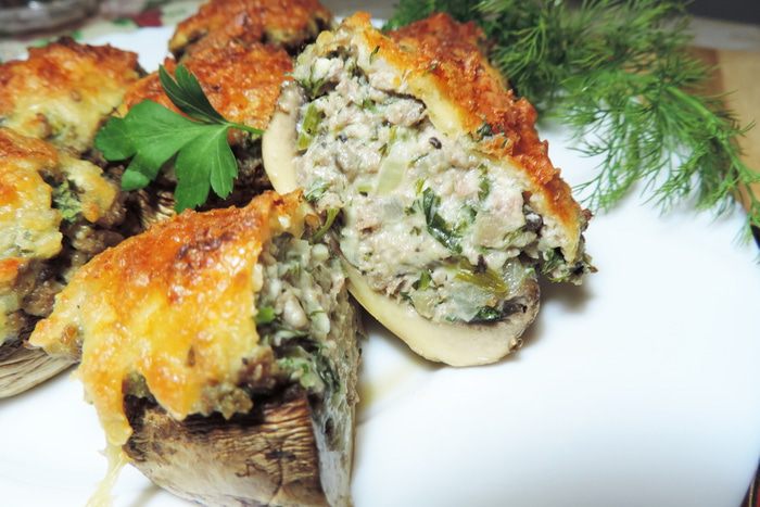 На растительном масле обжариваем мелко нарезанный лук, затем добавляем порезанные грибные ножки и извлеченную мякоть из шляпки. В последнюю очередь добавляем фарш и жарим до его готовности. Солим и приправляем по вкусу.