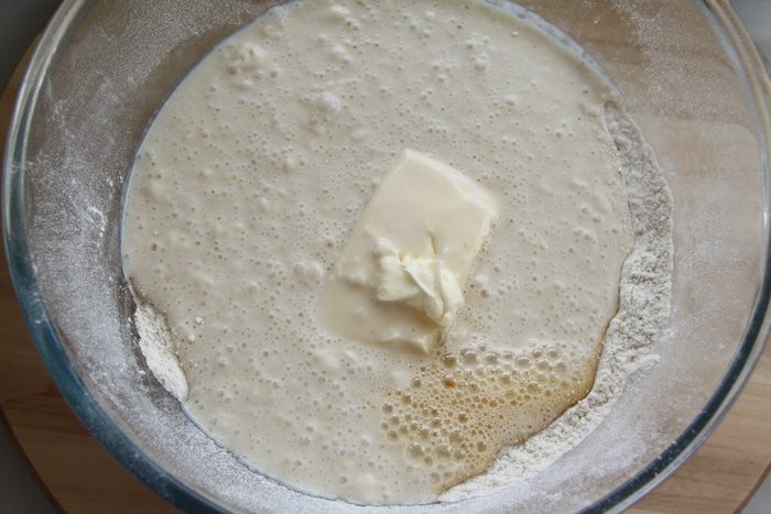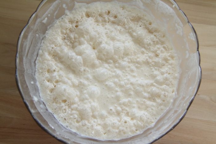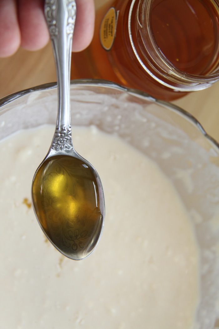 К опаре добавить ложку мёда. Оставить смесь на 30 минут в тёплом месте.